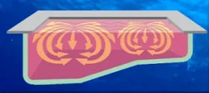 The left picture below shows the “Old Way” of circulation. Typically, only the top or upper layer of the pool water receives adequate circulation. The filtered water returns from the filter system in a straight, sometimes single jet. Warm heated water never truly gets all the way down to the bottom (how many times have you jumped into a “heated” pool only to be chilled from the waist down?) If you feel a temperature change, you are feeling STAGNANT water. In addition,our system will help to lift dirt & debris off the floor & up into the rest of the water where the skimmer and floor drain can take the dirt into the filter to be trapped & removed.